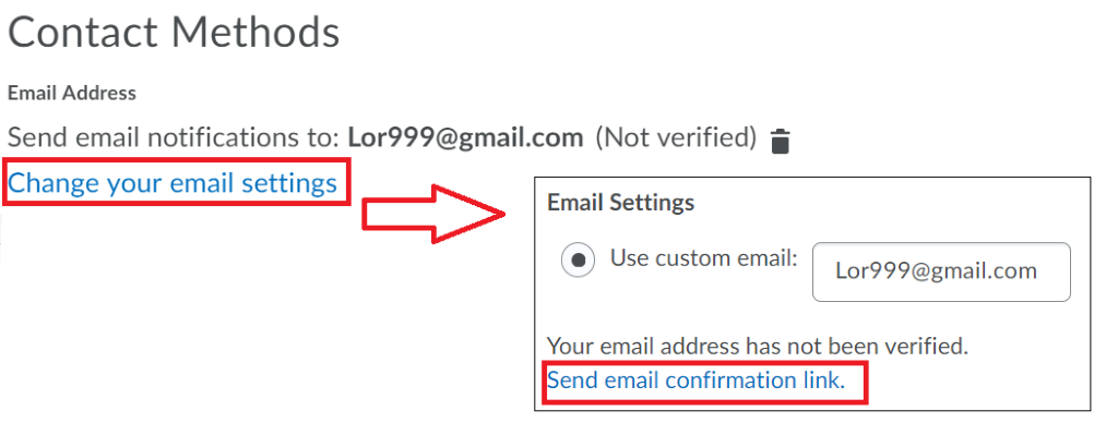 - Click “Change your email settings” then “Send email confirmation link”