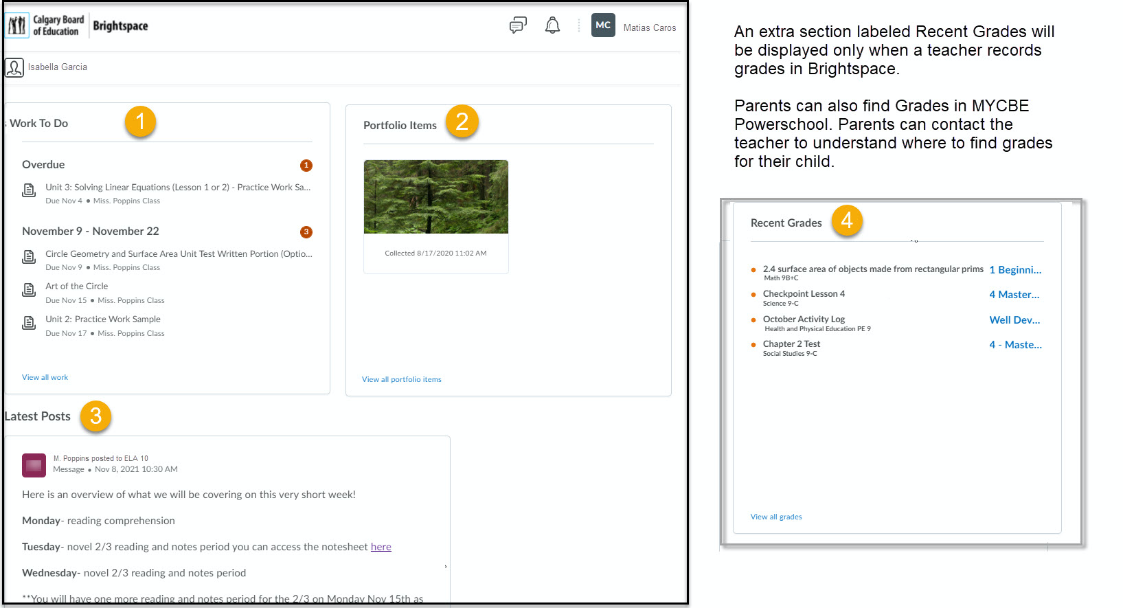 Parent and legal Guardian access via MYCBE can allow you to see a summarized view of your child's overdue items, upcoming work to do, student created Portfolio items shared by the teacher, news and homework reminders from the activity feed, and recent grades if the teacher records grades in Brightspace. You can also sign up to receive a weekly email notification of your child’s activity in Brightspace.