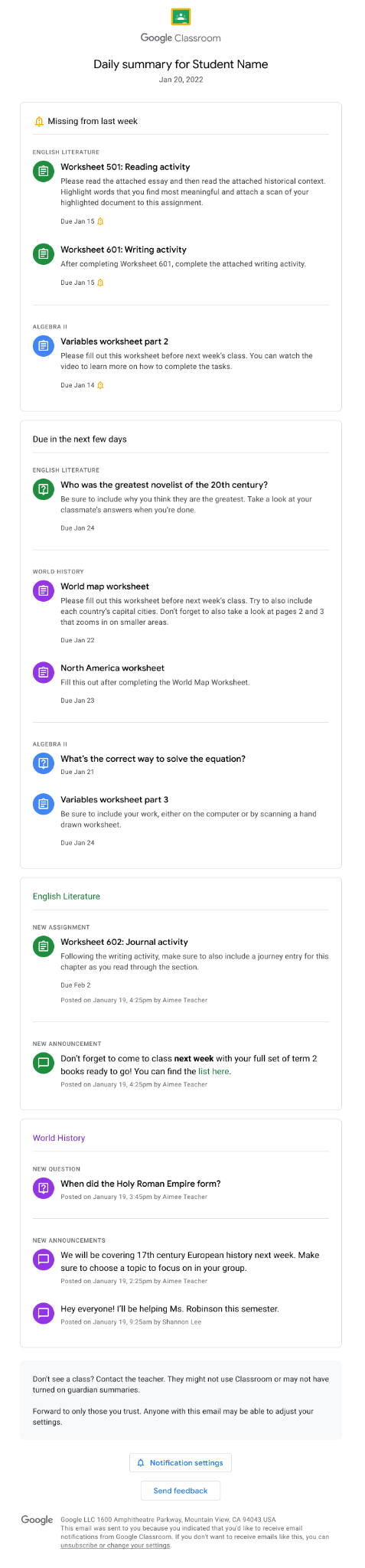 - *Upcoming work: Daily emails include work that is due today and tomorrow, or weekly emails include work that is due in the upcoming week.