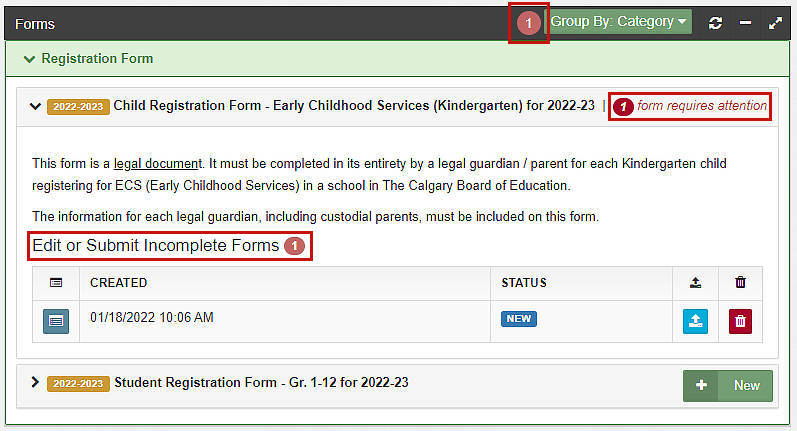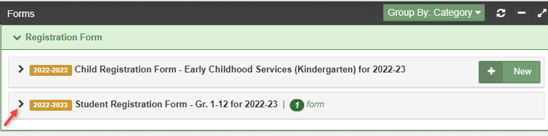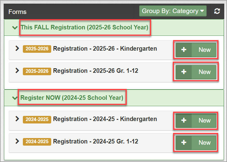 - In the Forms section, click the New button next to a form name to start a new form for the student.