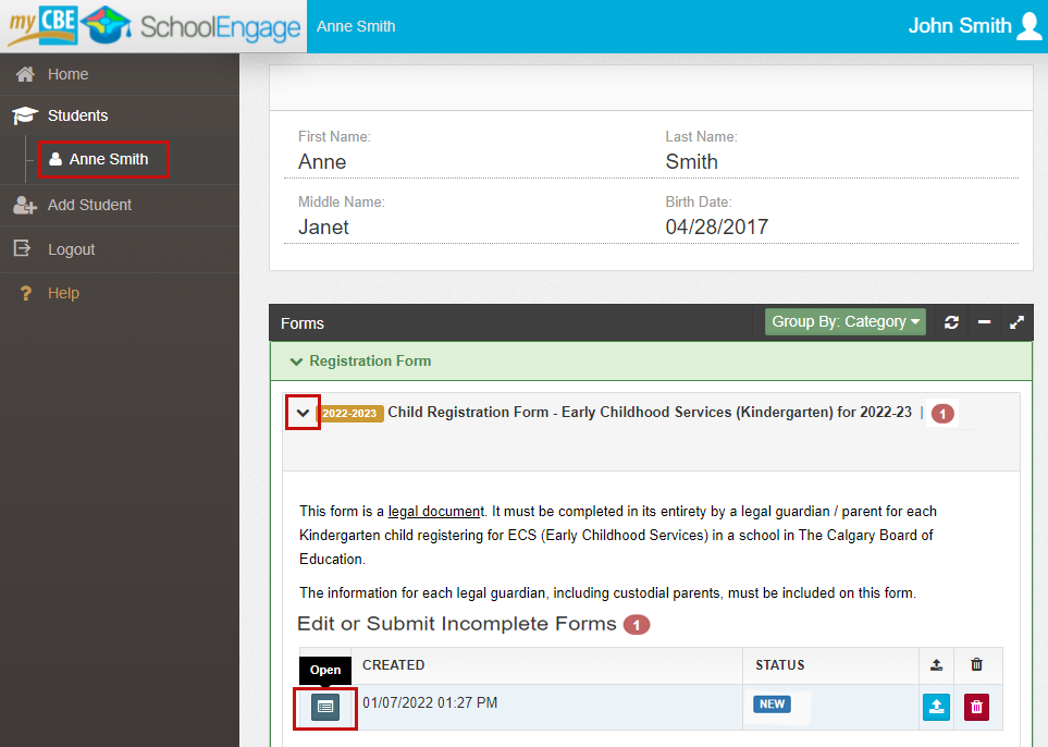 To open a saved form, go to the Students menu and select the student name. The student forms will appear. Click the form name to expand the form information then click the Open button (blue form) to re-open the form.